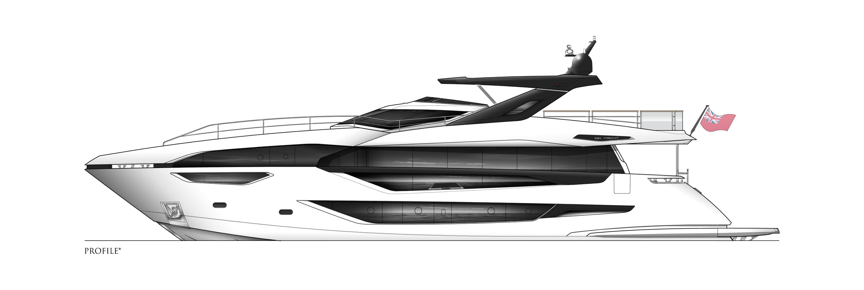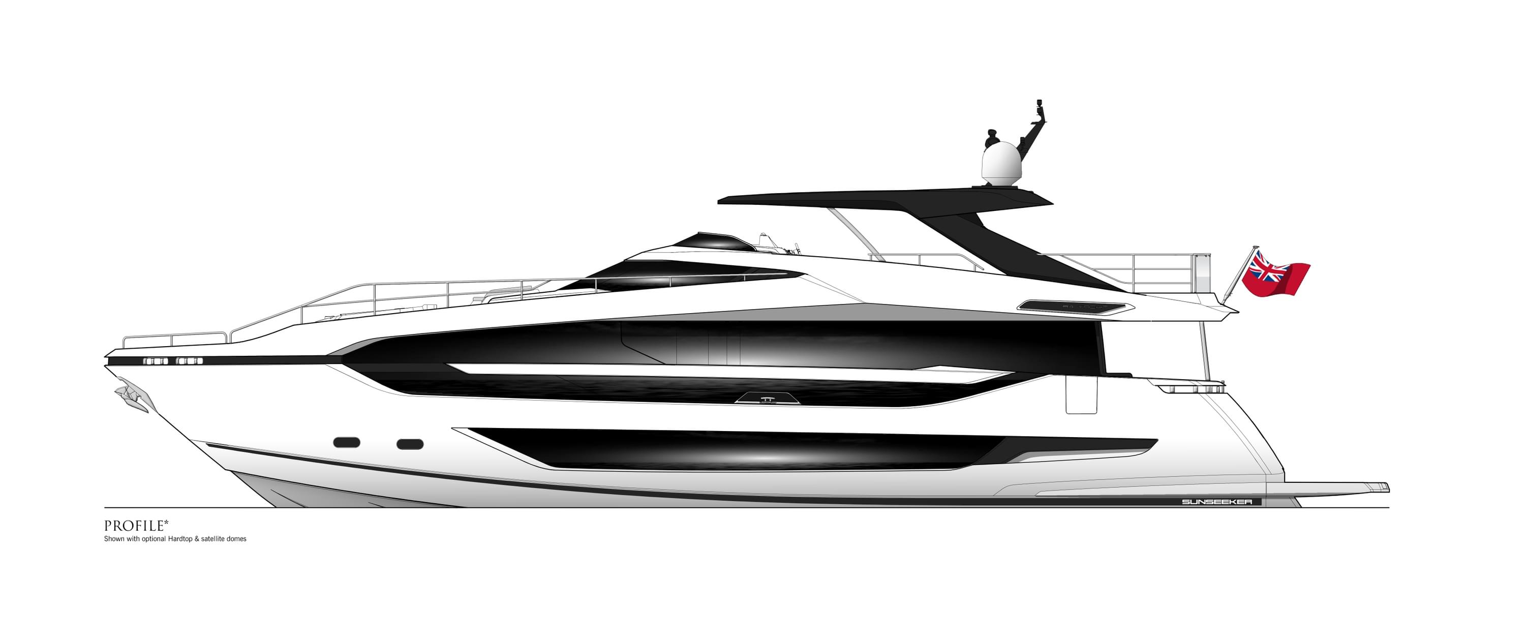 The Yacht features Sunseeker’s industry-leading ‘Beach Club’ accessed by sweeping dual staircases featuring recessed LED lighting. The ‘Beach Club’ transforms the area into a private outdoor sanctuary complete with an innovative and award-winning X-TEND™ sunbed that converts to face aft at water level or when raised forward into the cockpit. Set beneath is an overhead rain shower and plentiful stowage, including dedicated lockers for two SeaBobs. The extended bathing platform is perfect for carrying a tender with an optional flybridge crane for a jet ski or similar.